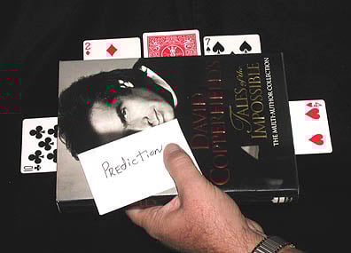 The top five cards of the shuffled pack are taken and displayed by being inserted into the edge of the book. The spectator is told to choose any of the five cards. The selected card is, for example, the four of clubs. The four unchosen cards are shown to be all different. When the fortune message is removed from the envelope, it reads: