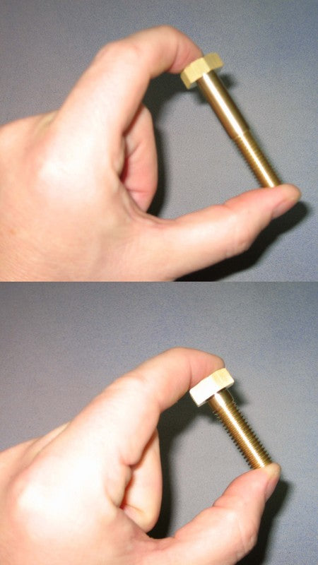 EFFECT: The performer displays two bolts. A spectator chooses either of the bolts. According to the spectator's choice, the performer picks one of the bolts and shakes it up and down. The shaken bolt is gradually shortened. The shortened bolt and the other normal bolt can then be handed to the audience for examination.