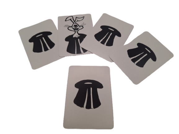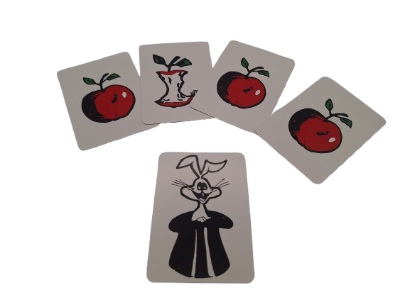 Effect: Four Apples are shown with four Hats of each of their backs, A rabbit appears in one of the hats and then he eats one of the apples! All the cards at the end can be handed out!