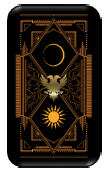 The magician holds the cards together and shows the back of the DEATH CARD which is dark and has the Sun, the Moon and 2-headed eagle.