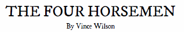 “Please, if you will, I ask you to name the way you think mankind will end. I know, it is a heavy thing to think about. But, is it War, the Red Horseman or famine, perhaps through overpopulation, with the Pale Horsemen? Maybe it would be pestilence with a new pandemic thanks to the White Horseman or a natural disaster of some type brought about by the Black Horseman?”
