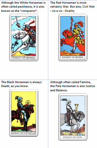 “I would like to focus on the Horsemen. Although the White Horseman is often called pestilence, it is also known as the "conqueror". The Red Horseman is most certainly War. But also, Civil War - vis a vis - Duality. The Black Horseman is always Death and a force of nature, as you know. Although often called Famine, the Pale Horseman is also Justice and Balance.