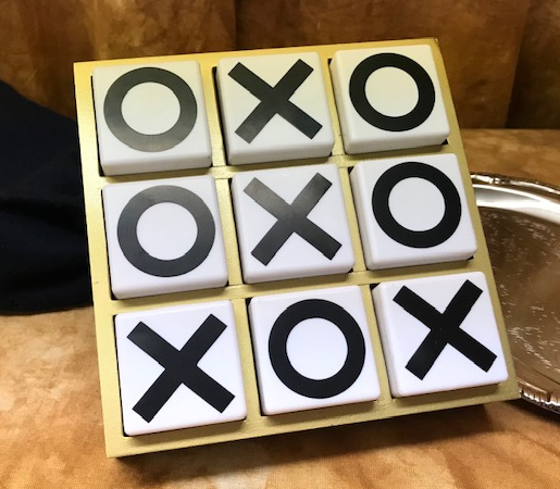 This is a great close-up or parlor piece of apparatus that provides a powerful punch. Expansions, variations, and instructions provided by some of magic most prolific creators! You set a folded piece of paper down next to a golden tray with raised plastic cubes marked with X’s and O’s. Then you and the participant play a game of tic-tac-toe, dropping the large cubes into spaces in the tray. Unfortunately, nobody wins… But wait – that tie game could have ended in any one of hundreds of different ways. You hand the spectator that folded paper and when she opens it, she discovers that you had pre-written a fully-played game of tic-tac-toe and it matches exactly the one just played in the golden tray. You have predicted the exact outcome.