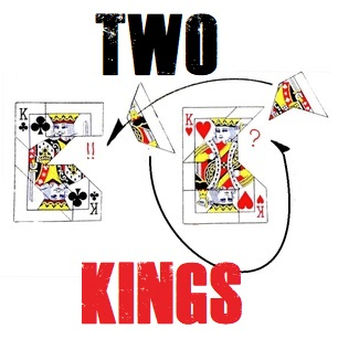 Based on an Atsukawa Masao application. Interactive, highly visual with a perplexing ending. Effect: Performer produces two envelopes, one red and one black. In the black envelope is a jumbo blue-backed king of clubs. In the red envelope, a jumbo red-backed king of hearts. Both cards have been cut into six individual pieces like a jigsaw puzzle. The magician removes the pieces from the envelopes one at a time, and solves the puzzle so that the audience sees the two face-up kings.