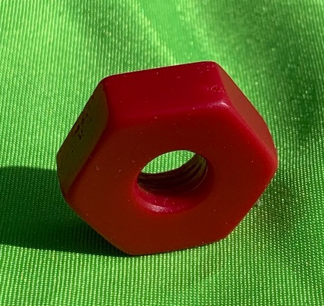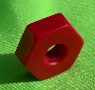 Hand-crafted to resemble a plastic nut found at a hardward store or in a toy store. Being that its not metal it's a great covert piece. Approximately .75 x .75 x .25 inches.