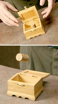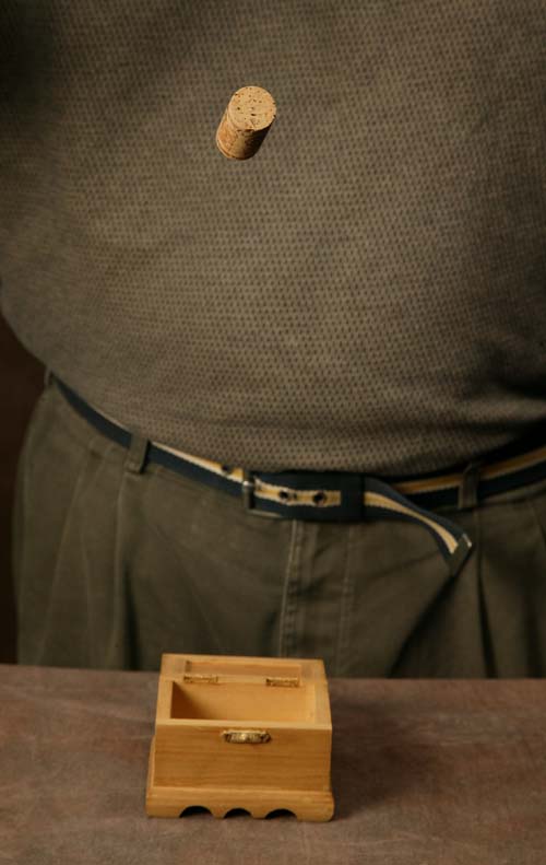 The performer sets approx. 3 x 3 x 2-inch solid wood box on the table. When he opens it, an ordinary wine cork is seen inside. At the performer’s command, the cork begins to quiver and slowly rises out of the box. The cork floats and moves above the box. The performer brings out a 3-inch ring, which he passes over, under and around the floating cork! The cork slowly returns to the box.