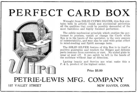 Effect: Wrought from SOLID CUPRO SILVER, this Box contains both in artistic finish and mechanical perfection all the qualities that could be possibly demanded of the most fastidious and highly finished performer. The subtle mechanical principle which enables the performer to produce, vanish or change the Cards while Box is in the hands of the spectator, is the very essence of indetectability, and may also be used with great effect in mind reading and Spirit message tests.