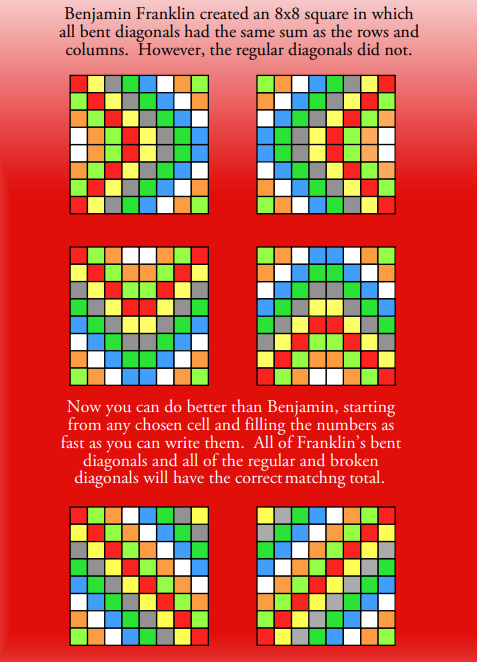 - Starting from any cell chosen by the audience, create in real tie an eight-by-eight magic square that is significantly better than the famous one created by Benjamin Franklin. Conquer the notoriously difficult six-by-six case starting from ANY chosen cell.