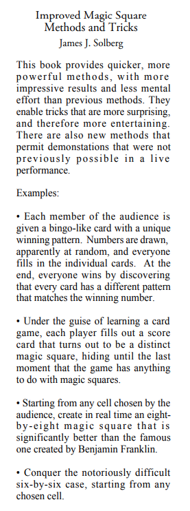 While it sounds like a sales pitch - its a true fact - Jim's previous three books on Magic Squares remains some of the most successful books we have ever sold at Stevens Magic. Even better, there is no shelf-life to these books. Magic Squares always will provide jaw dropping incredible entertainment, and than can be applied in any venue. That's why top pro's like Piff The Magic Dragon, Greg Gleason and so many others incorporate them in their shows.
