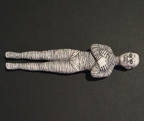 An elegant cabinet along with a mummy are displayed. The mummy is shown to be perfectly solid and is openly placed into the cabinet. The cabinet is then closed while the head and feet of the mummy remain in full view. Next, four brass rods are shown and pushed right through the cabinet from top to bottom, securing the mummy on all sides. Now, a brass blade is shown and immediately see-sawed back and forth through a slit running across the middle of the cabinet, apparently cutting the mummy in half! All is then reversed and the mummy is shown to be unharmed and still perfectly solid!
