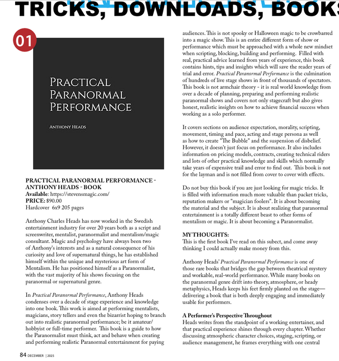 In Practical Paranormal Performance, Anthony Heads condenses over a decade of stage experience and knowledge into one book. This work is aimed at performing mentalists, magicians, story tellers and even the bizarrist hoping to branch out into realistic paranormal performance; be it amateur/hobbyist or full-time performer.