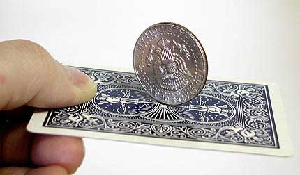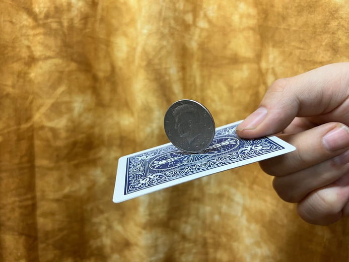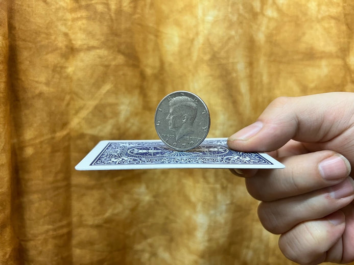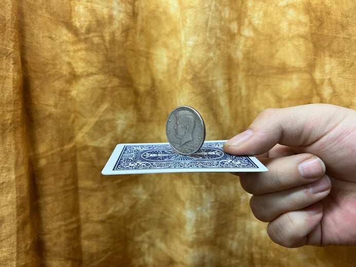 What a Fooler! Can be done right under their noses and eyes! The performer shows an ordinary half dollar and places it on a playing card. Unbelievably, the coin begins to move by itself. It rises up from the card and stands on its edge. It doesn't stop there, the magician gives it a little flick and the coin literally spins (as if it was dancing on top of the card!). Then slowly upon the performers command the coin starts to descend, just as it rose earlier, until it lies on the card flat (to its original position on the card). They won’t believe this one! Carry it in your pocket all the time and be ready to blow them away! Created by Mark Stevens in 1990, with respects to Georges Proust (Paris, France) and John Cornelius. A Stevens Magic Emporium creation and exclusive for over 30 years!