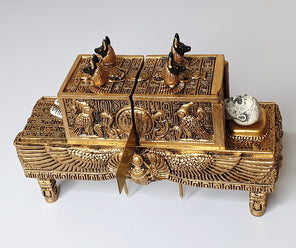 An elegant cabinet along with a mummy are displayed. The mummy is shown to be perfectly solid and is openly placed into the cabinet. The cabinet is then closed while the head and feet of the mummy remain in full view. Next, four brass rods are shown and pushed right through the cabinet from top to bottom, securing the mummy on all sides. Now, a brass blade is shown and immediately see-sawed back and forth through a slit running across the middle of the cabinet, apparently cutting the mummy in half! All is then reversed and the mummy is shown to be unharmed and still perfectly solid!