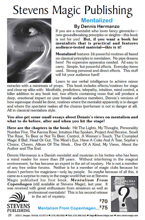 "In his second book, Dennis has adapted further brilliant principles from some of the best in our community. Mentalized is a beautifully produced and illustrated large size book, with practical, creative and diabolical material that you will easily fit to your own style of performing. Not only is this a great addition to any discerning mystery performers library, but one that you will likely find yourself referring back to" - Steve Drury. (Co-Founder of PSYCRETS British Society of Mystery Entertainers.)