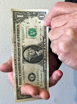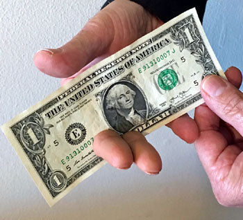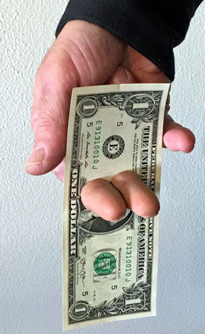 Effect: A Bill (currency) is borrowed by the performer, (any currency can be used) it is then shown on both sides, displaying the bill horizontally for all to see, the performer proceeds to VISIBLY push their extended index and middle fingers right THRU THE BILL, resulting in the performers fingers visually PENETRATING the bill, in one side and out the other side of the borrowed bill!
