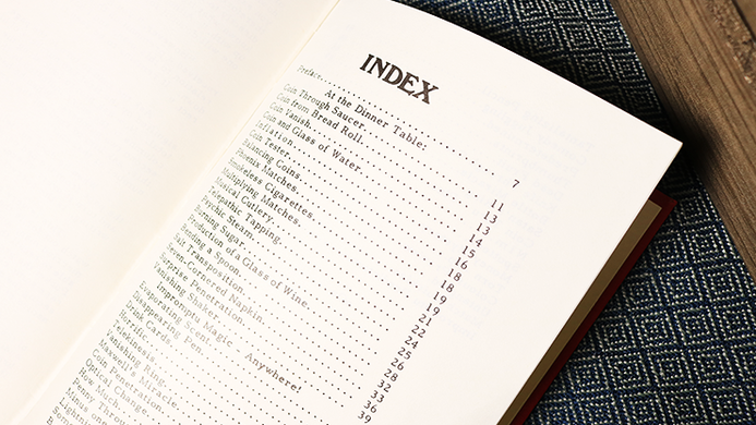Some of the effects include: Coin Through Saucer, Coin From Bread Roll, Coin and Glass of Water, Balancing Coins, Phoenix Matches, Multiplying Matches, Psychic Steam, Burning Sugar, Production of a Glass of Wine, Bending a Spoon, Salt Transposition, Seven-Cornered Napkin, Vanishing Shaker, Disappearing Pen, Telekinesis, Vanishing Ring, Penny Through the Table, Something From Nothing, Tantalizing Pencil, Torn Up, Color Preview, Impromptu Prediction, plus much, much more!