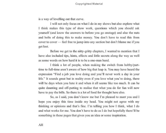 It covers sections on audience expectation, morality, scripting, movement, timing and pace, acting and stage persona as well as how to create "The Bubble" and the suspension of disbelief. However, it doesn't just focus on performance. It also includes information on pricing models, contracts, creating technical riders and lots of other practical knowledge and skills which normally take years of expensive trail and error to find out.