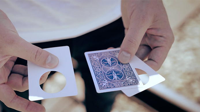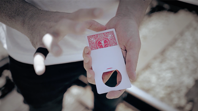 Place your spectator's signed card between 2 cards having large holes, so their card can be seen at all times. In the blink of an eye, the back of your spectator's signed card changes colors!
