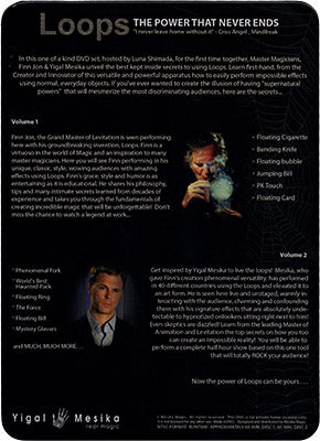 In this one of a kind DVD set, hosted by Luna Shimada, for the first time together, Master Magicians Finn Jon & Yigal Mesika, unveil the best kept inside secrets to using Loops. Learn first-hand, from the Creator and Innovator of this versatile and powerful apparatus how to easily perform impossible effects using normal, everyday objects. If you've ever wanted to create the illusion of having "supernatural powers" that will mesmerize the most discriminating audiences, here are the secrets...