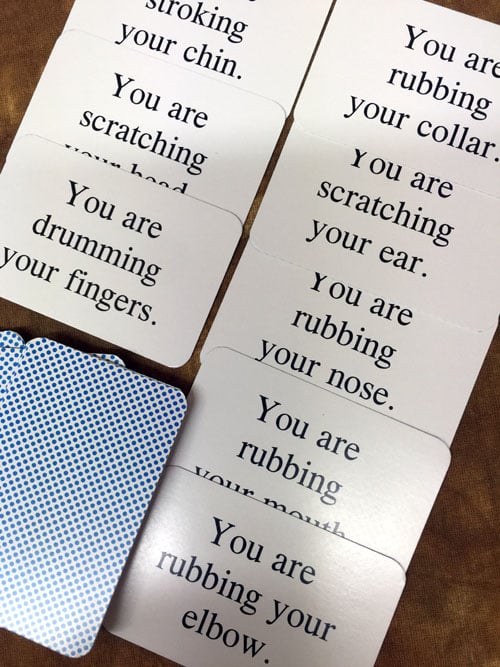 “Let’s look at mine first,” says the performer… The person turns up that card, and read its message out loud. It states: YOU ARE SCRATCHING YOUR EAR. The group looks at the performer, who has indeed been engaged in that very activity. “That’s amazingly accurate!” the performer exclaims. The audience is not sure; it certainly seemed that the performer had started scratching his ear before the message was disclosed, but… The performer presses on with enthusiasm, telling the participant, “Read out what’s written on the card you choose for yourself, and let’s see if your message is as appropriate as mine.” The card is turned over. Its message reads – YOU WILL SELECT THIS CARD!