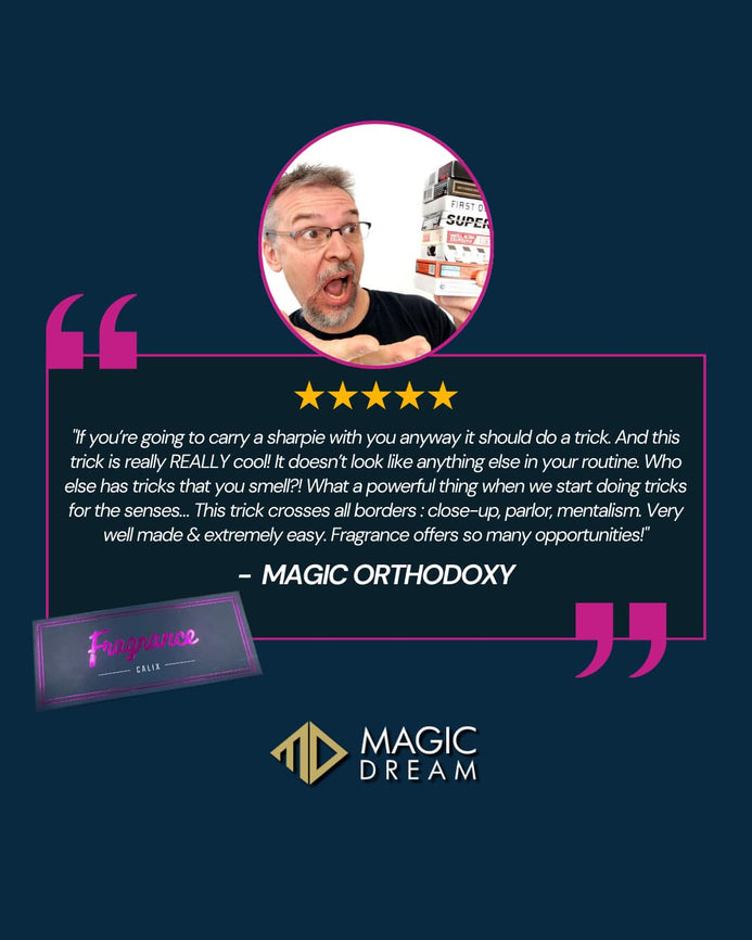 "If you're going to carry a sharpie with you anyway it should do a trick. And this trick is really REALLY cool! It doesn't look like anything else in your routine. Who else has tricks that you smell?! What a powerful thing when we start doing tricks for the senses... This trick crosses all borders: close-up, parlor, mentalism. Very well made & extremely easy. Fragrance offers so many opportunities!" - Magic Orthodoxy