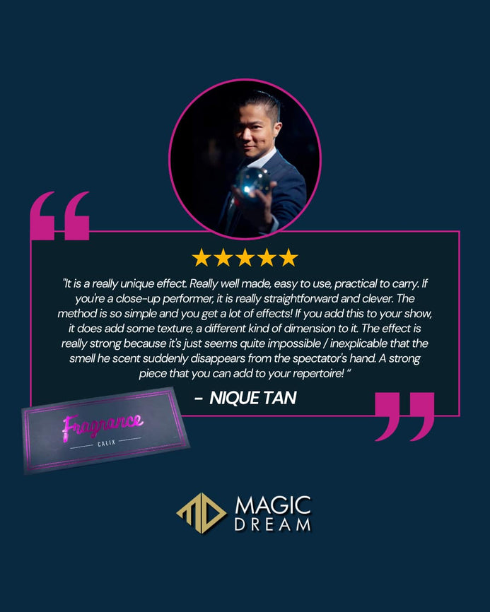It is a really unique effect. Really well made, easy to use, practical to carry. If you're a close-up performer, it is really straightforward and clever. The method is so simple and you get a lot of effects! If you add this to your show, it does add some texture, a different kind of dimension to it. The effect is really strong because it just seems quite impossible/inexplicable that the smell the scent suddenly disappears from the spectator's hand. A strong piece that you can add to your repertoire!" - Nique Tan