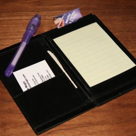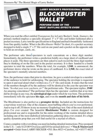 This is a Himber Wallet found in the collection of Larry Becker. This was the wallet Larry used for his famous "Blockbuster Wallet Routine". It works perfectly as a wallet for Add-A-Number Routines, as a prompter or for obtaining pre-show information invisibly.