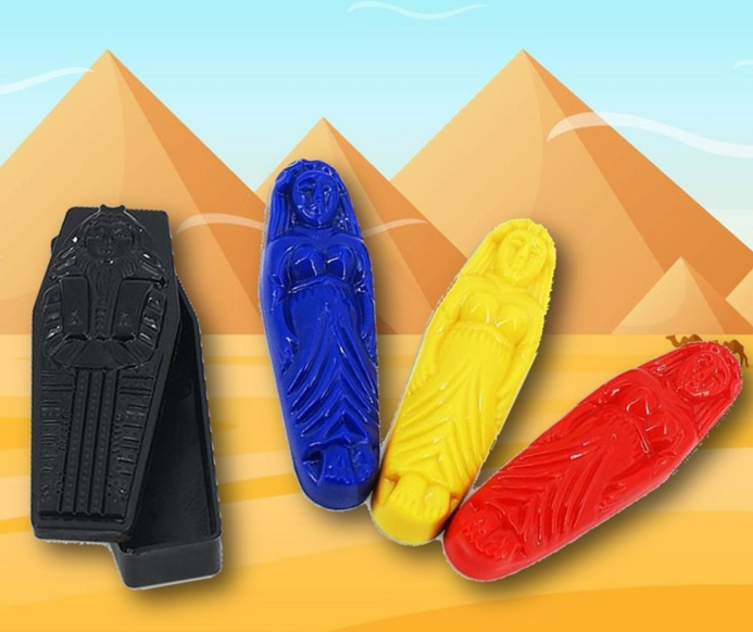 Where's my mummy? Fun easy mind magic with a great theme. When your back is turned, your spectator places one of the three mummies (blue, yellow and red) into the sarcophagus and closes the lid. The other two are hidden out of sight. Turning round, and without touching the sarcophagus or asking any questions, you instantly reveal the color of the mummy seal inside the coffin.