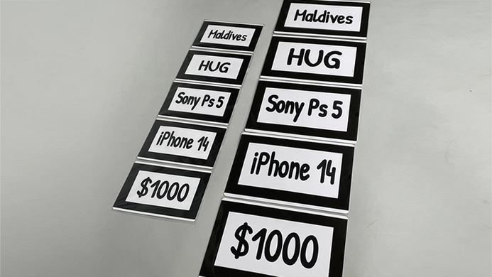 You ask a participant to choose the future for the world by displaying 5 boards with five numbers on it. The participant makes their selection, and you reveal to the audience what they selected which reads "PEACE," which is good thing of course.