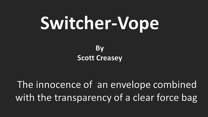 In this thirty-minute video, Scott shares the quick-and-simple manufacturing process using a window or non-window envelope to manufacture his Switcher-Vope, which combines the innocence of a standard envelope with the transparency of a clear force bag. Importantly, he teaches his own handling for this very versatile billet-switching device, detailing the key points that will help you create a miracle for your spectators!