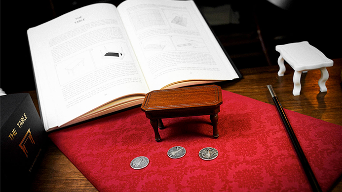 You show a small ornate wooden table that can be handed out for examination. You then introduce 4 half dollars and one by one cause the coins to visibly penetrate the table with no cover. At the end of the performance, you drape black silk over the table and with a gentle press cause the table to penetrate the working surface or vanish entirely.