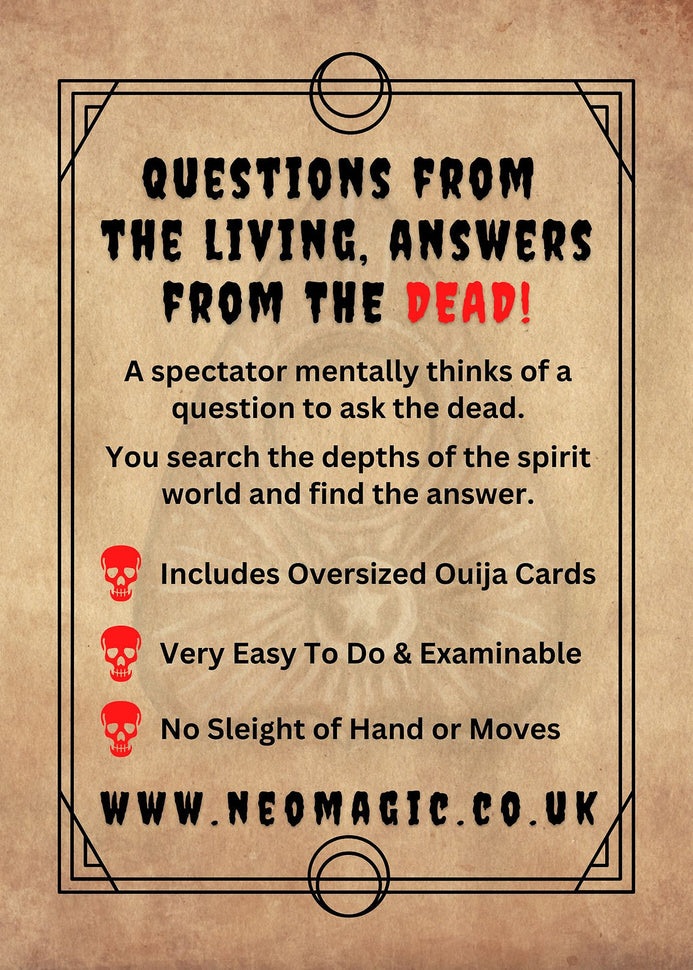 Ouija cards are beautifully designed, with intricate, mystic symbols and letters that mirror the classic Ouija board. These cards are your connection to the spirit world and will guide your performance. The spectator merely thinks of a question to ask the dead and you venture over to the other side and find the answer.