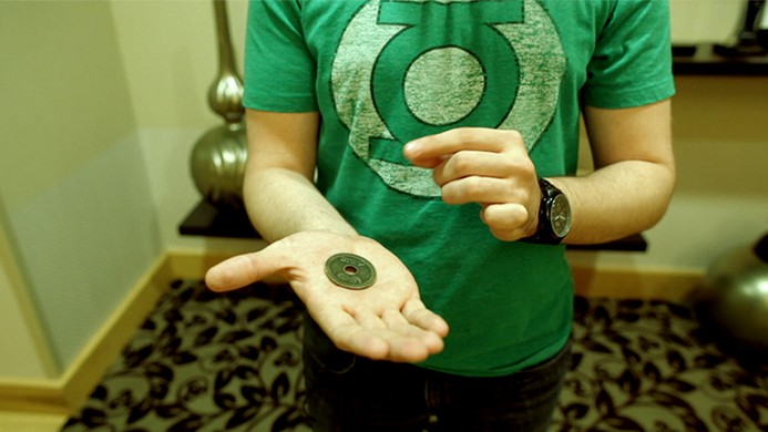 The magician holds a coin on the palm of his hand. Without any visible cover, the coin changes into another coin, or any small object that can it into your hand! This and many more impossible changes are possible with Ryan Bliss' The Bridge Change.