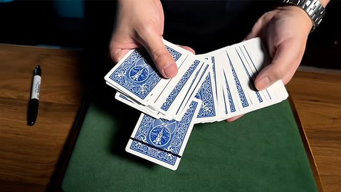 Here's how it works: A spectator picks a card freely, signs their name on it, and puts it back into a random place in the middle of the deck. The magician draws a black line on the top card; suddenly, the black line moves instantly, jumps to different positions, and then disappears in a flash.
