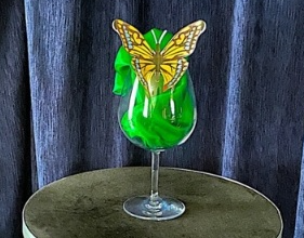 Now the butterfly is placed inside the wine glass and a silk is placed over the glass.