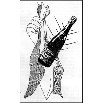 Show three different colored silks, holding them in your fist by their corners. One at a time, separate them out and throw them up into the air so everyone can see (tacitly) that they are not hiding anything. When all three silks are brought back to their original position, the lower corners are slid over the hand, and instantly... a BOTTLE OF CHAMPAGNE appears, after which a DOVE and a BOUQUET OF FLOWERS can also be produced!