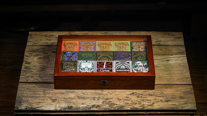 Each detail of both function and form is carefully considered. Strict quality control standards have been formulated and each wood board and empty slot has to be precisely measured and cut during the production process. It fits a standard-size playing card tuck box perfectly.