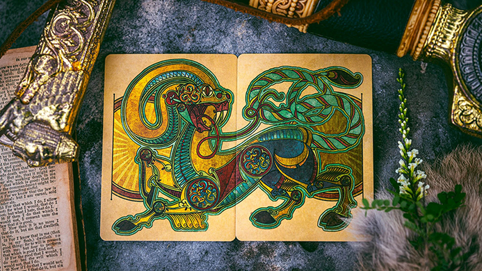The Arthurian Holy Grail Edition playing cards are hand-illustrated, medieval playing cards celebrating the story and legend of King Arthur and many characters that have surrounded his court for hundreds of years. This medieval playing card deck is illustrated in the style of The Book of Kells that is believed to have originated in the same geographical area around the same time as the legend of King Arthur.