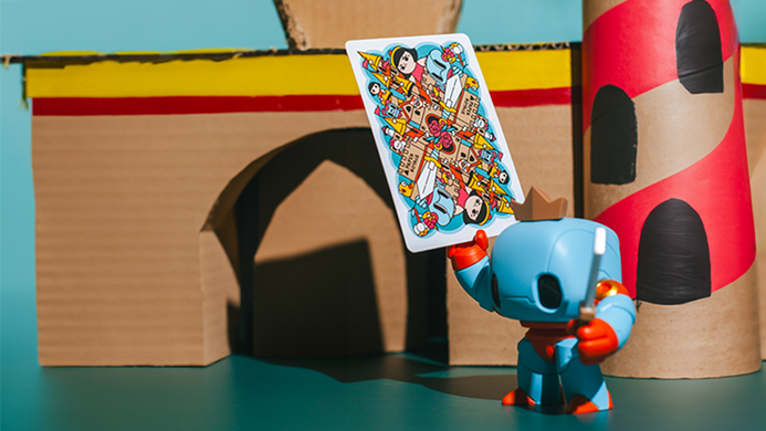All 56 cards display its own uniquely drawn illustrations, each depicting a whimsical tale of BBG and Vee5's enchanting tea-time party. From the illustrated jokers featuring a jack-in-a-box to the distinct diagonal two-way back design, no card has been left untouched. The deck's standout feature is the quadriptych, consisting of two sets of 4-card court cards that combine to form a larger image.