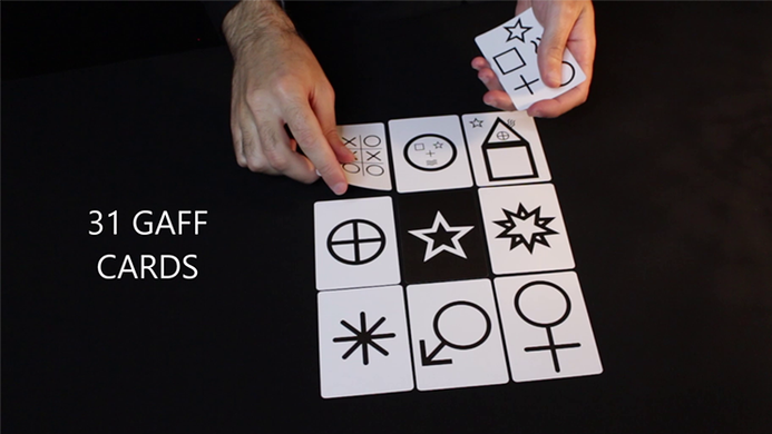 The Assistant: The spectator chooses a card from all the ESP cards. Then you present the card with your assistant on it which is made up of all the ESP symbols. You turn this card over and rub it against the spectator's card. When the card is turned over again, you discover that the assistant has only one eye left because the symbol chosen by the spectator has disappeared.