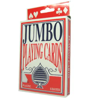 These jumbo decks are 12cm(5inches) x 9cm(3.5inches) and great for higher or lower or charity games as well as display games and those with limited vision / mobility. They are plastic coated paper for a good life and of nice quality for the price.