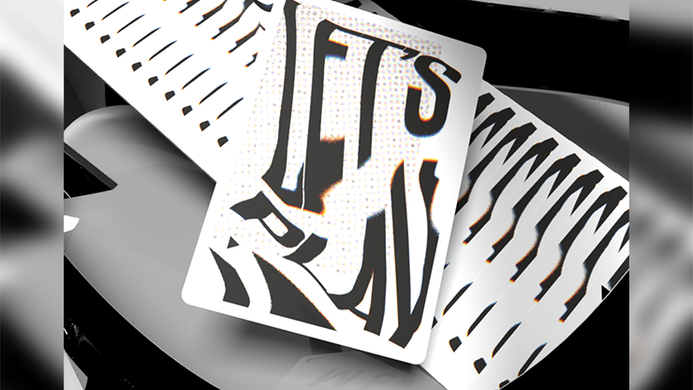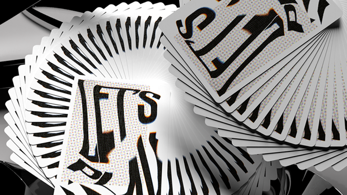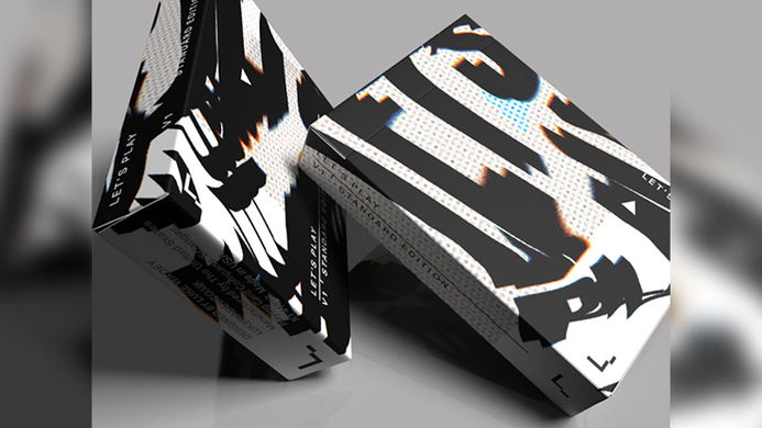 The card back layers differing textures and warped typography - the words 'Let's Play' distorted across the card, broken and twisted to fill the space, it's design's bold use of contrast held within a boarder makes for dynamic springs, fans and spreads. The cardist, the collector, the spectator are sure to enjoy watching this deck in motion - how does it make you feel?