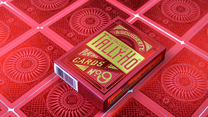Tally-Ho MetalLuxe xc2xae Playing Cards are the ultimate luxury collectible playing card deck. Tally-Ho MetalLuxe Playing Cards feature the classically beautiful Tally-Ho circle card back design in a collector's edition metallic foil. The tuck case and card back are both stamped with real metal foil to achieve a brilliantly dazzling shine. The tuck case features a beautiful, eye-catching red foil as well as a gleaming gold foil, while the card backs are stamped with a stunning red foil to create the classic Tally-Ho Circle Back design.