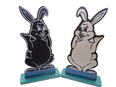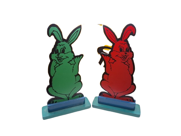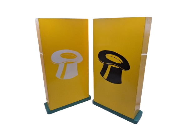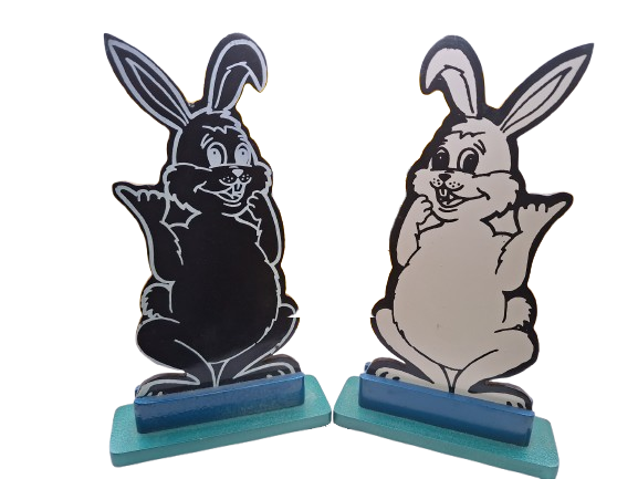 Perfect for children's shows. Loads of laughter! Have a black cut-out and a white cut-out rabbit miraculously switch places from within their designated enclosed boxes. The switching can happen multiple times to create pure laughter.