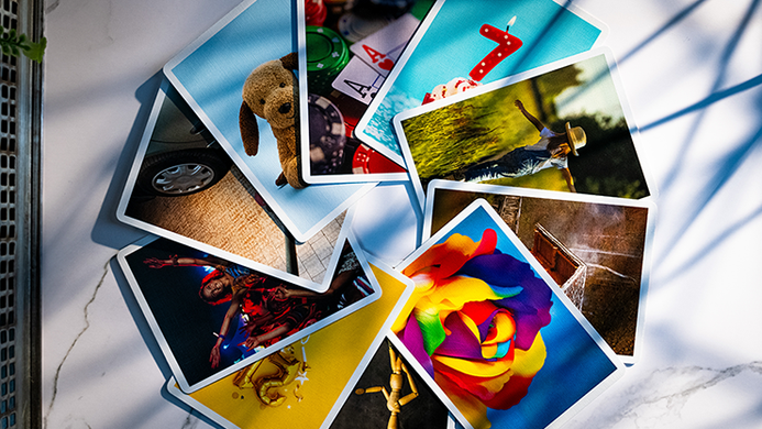 • A pile of cards is shuffled multiple times and laid face up by the audience. They appear to be ordinary pictures on the cards until you point out that the images are homonyms and all of the cards in order spell out a phrase... that is a printed prediction that's been written on the box from the very beginning!