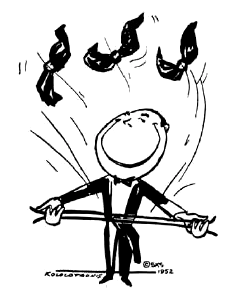 Three 18-inch silks are tied – one at a time- around the center of two ropes and everything is freely shown. The know are genuine and the silks are actually tied around the ropes. Holding the ropes fully extended, the performer looks up toward the ceiling and counts to three. Suddenly, the silks leave the ropes and fly upward to at least 3 feet in the air!
