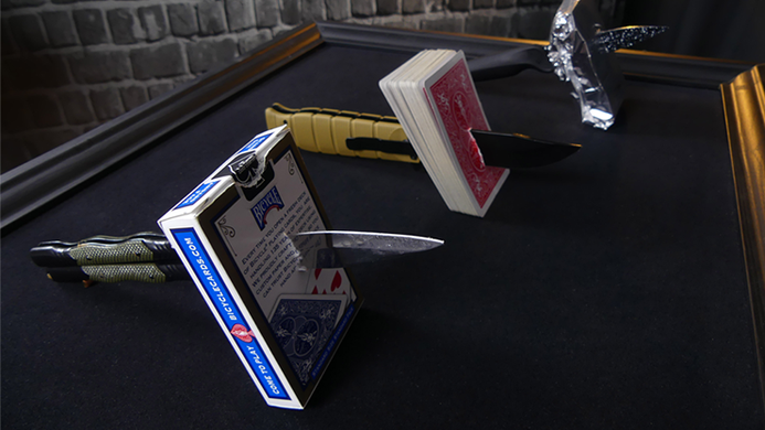 A card is selected, signed and placed back into the deck. After shuffling the deck and placing it back into the card box, the magician takes a knife and stabs it trough all of the cards. Suddenly, the knife is slid quickly to the side with only ONE CARD STABBED on it, and of course, it is the signed card.
