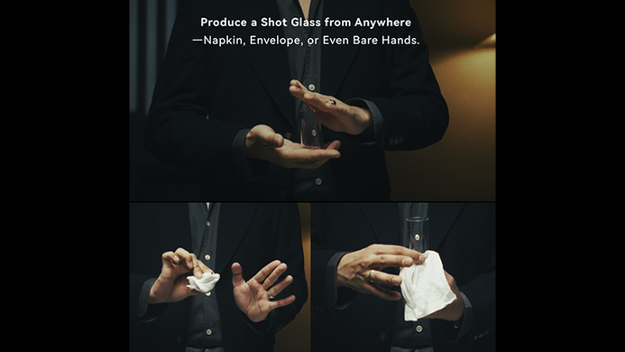 Produce a shot glass from anywhere-napkin, envelope, or even bare hands. Then, magically fill it with a shot of liquid.