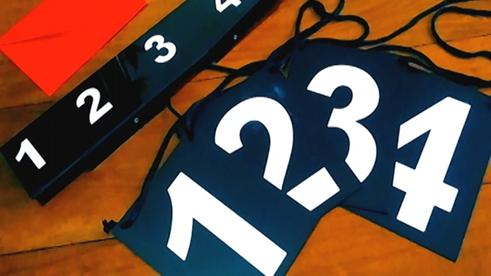 Next, he calls 4 spectators and places a plate with a number on each one (numbers 1 to 4) hanging from their necks.