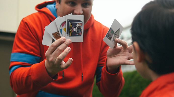 Then the letter is mixed with the others. The magician makes the letter vanish from the pack and travel to North Pole! Now he shows a big poster, when he open it we can see Santa Claus holding a letter and Rudolph and his red nose by his side.